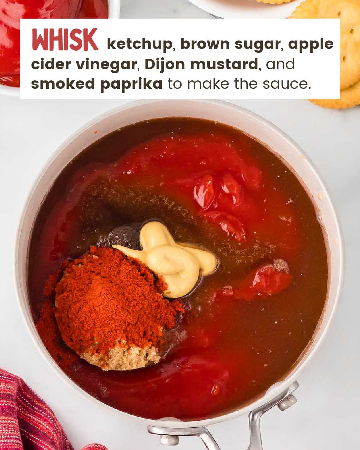 - Whisk ketchup, brown sugar, vinegar, Dijon, and paprika for the sauce.