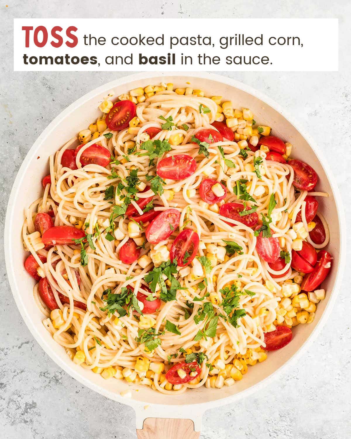 - Combine the cooked pasta, grilled corn, tomatoes, and fresh basil to the skillet. Toss gently to coat everything in the sauce. Serve warm or chilled.